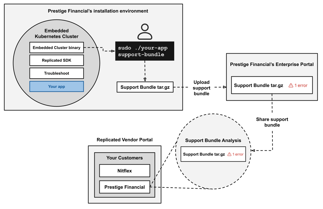 Your customers can share their support bundles with your team by sending you the tar.gz file. No data is shared outside the cluster unless the tar.gz support bundle file is explicitly shared by the end customer.